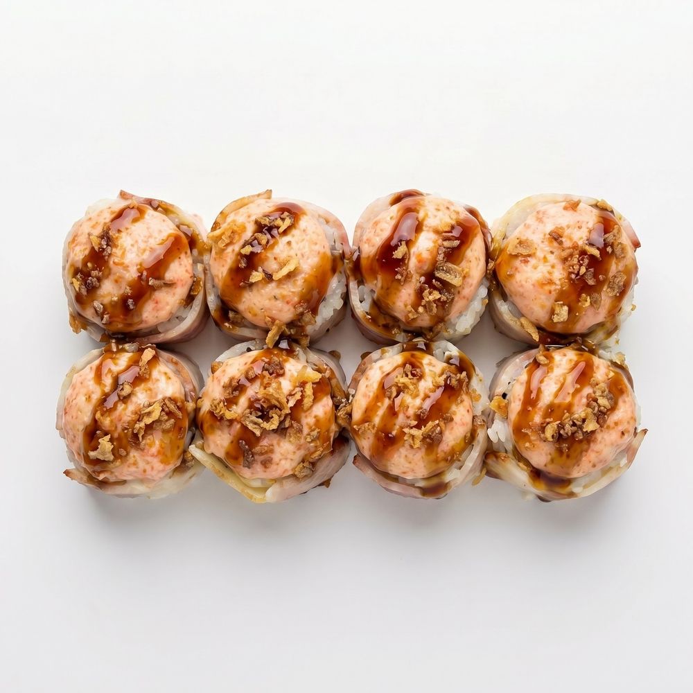 Состав:Бекон,Рис,Нори,Сыр,Лук зеленый,Перец болгарский,Курица коп,Терияки,Лук криспи,Майонез,