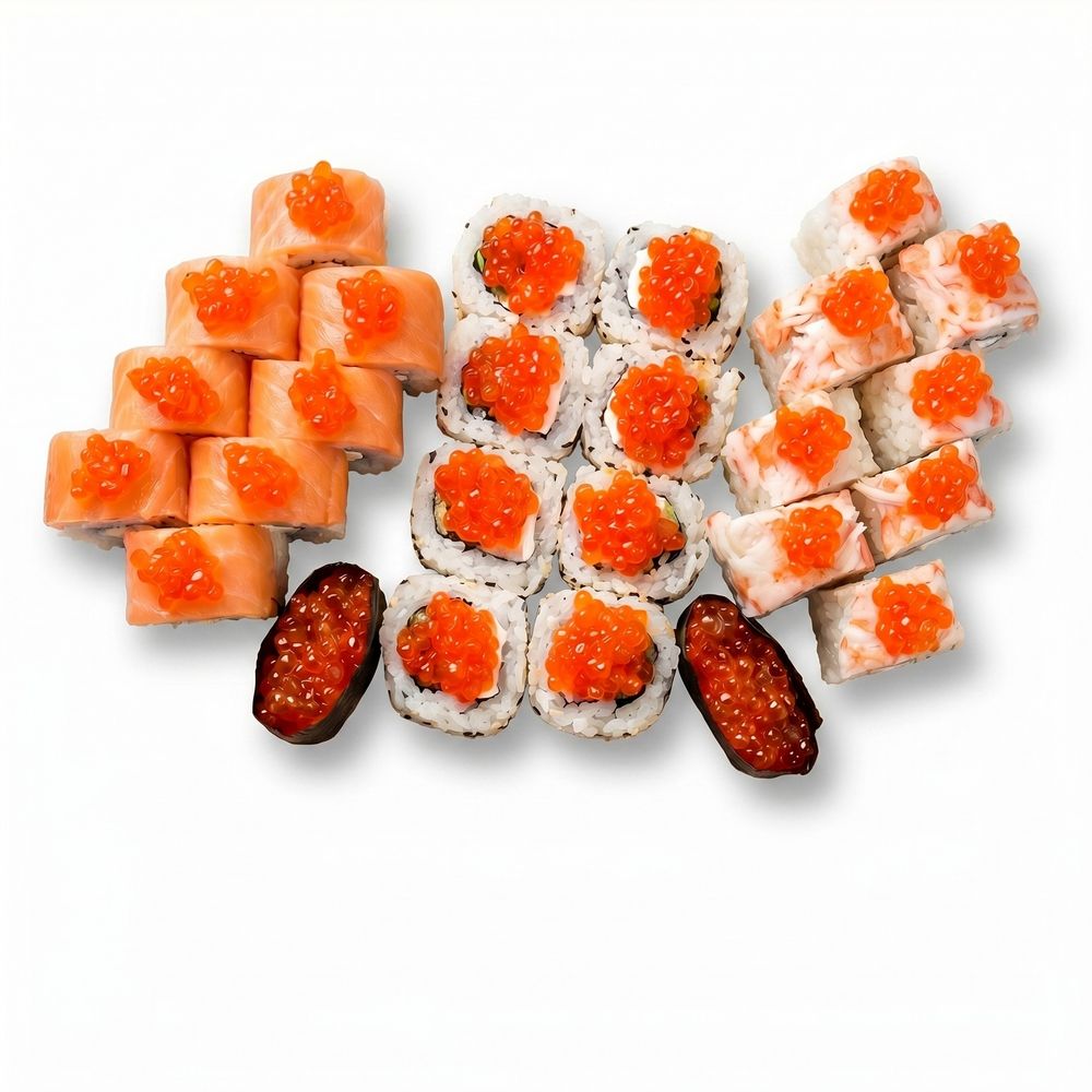 Состав:Фила лайт креветка,Фила лайт лосось,Каприз,Суши икура 26шт.
