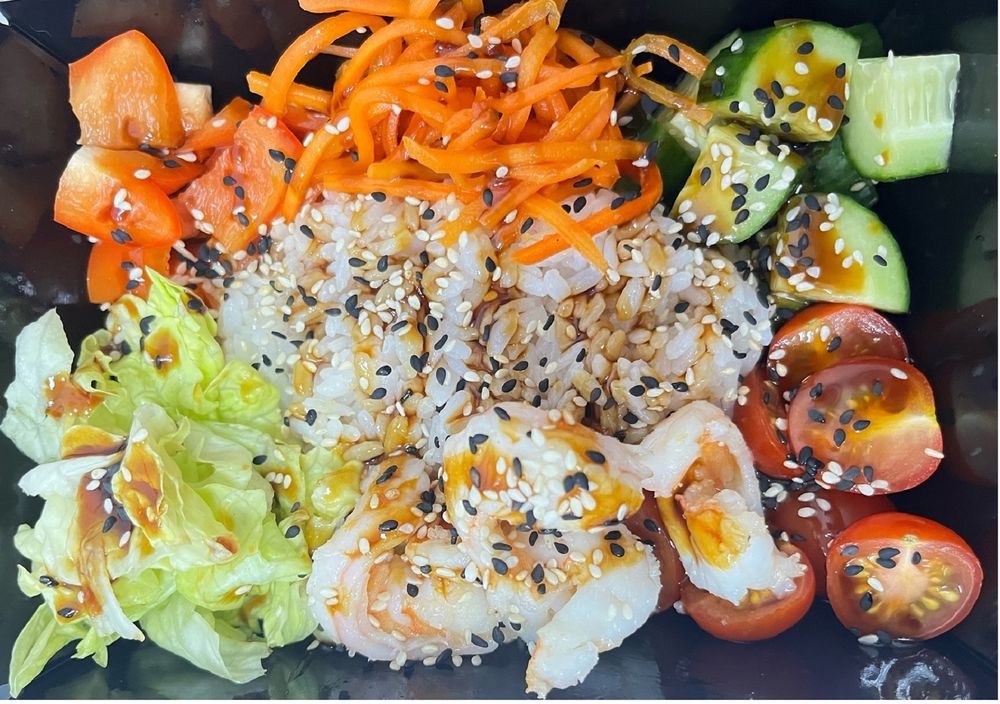 Состав:Креветки,Айсберг,Огурец,Черри,Морковка по корейски,Рис,Св перец ,Соус кунжутный,Кунжут