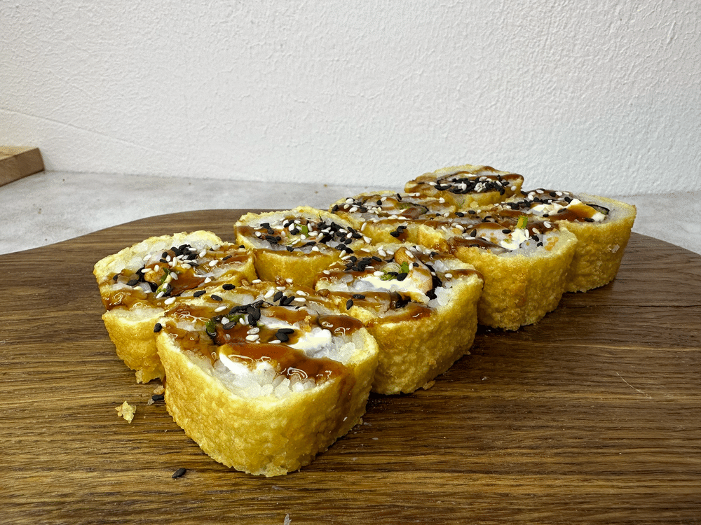 Рис,Нори,Сыр,Помидоры,Бекон,Лук зеленый,Креветка,Спайс,Терияки ,Кунжут,