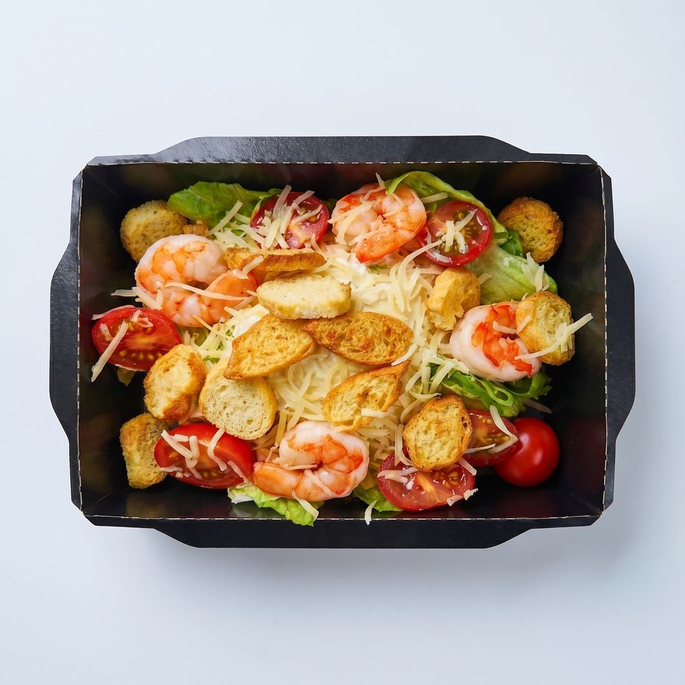 Айсберг,Чери,Пармезан,Креветки,Соус Цезарь,Сухари.