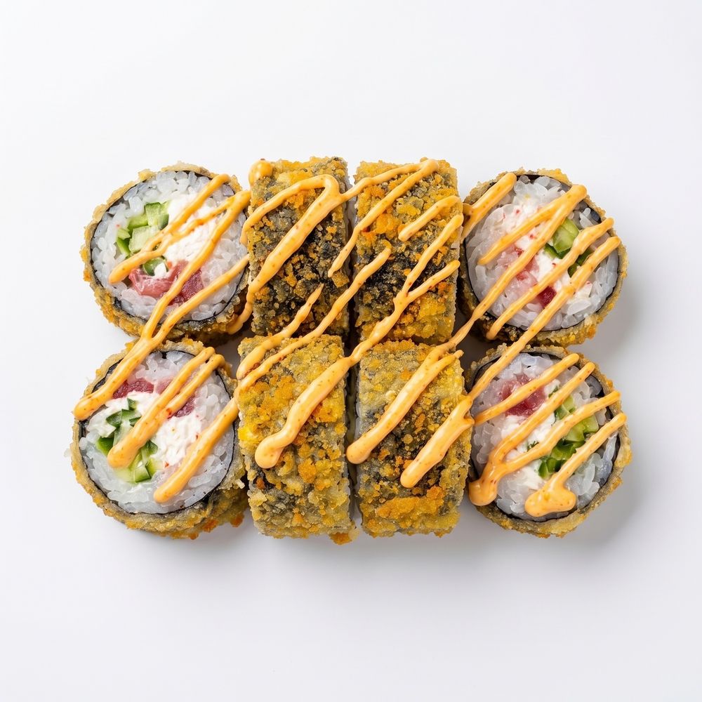Рис,Нори,Снежный краб,Тунец,Огурцы,Спайс,Сыр,Майонез.