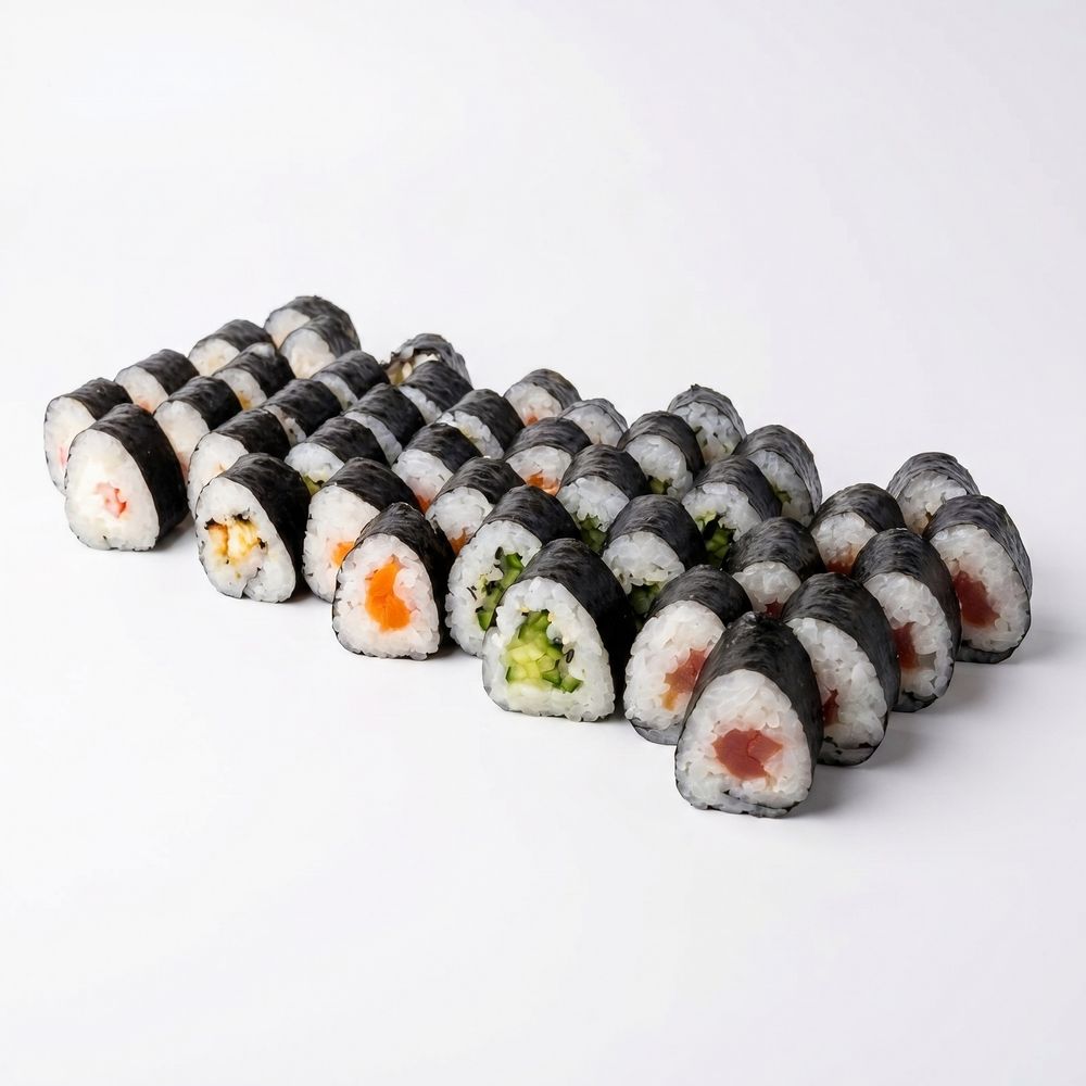 Состав:Ролл с огурцом,Ролл с Тунцом, Ролл с креветкой,Ролл с угрем,Ролл с лососем.Количество:40 шт