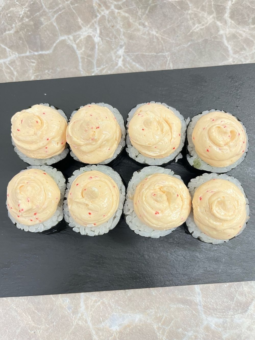 Состав:Рис,Нори,Лосось,Огурцы,Сыр,Соус спайс,Масаго.