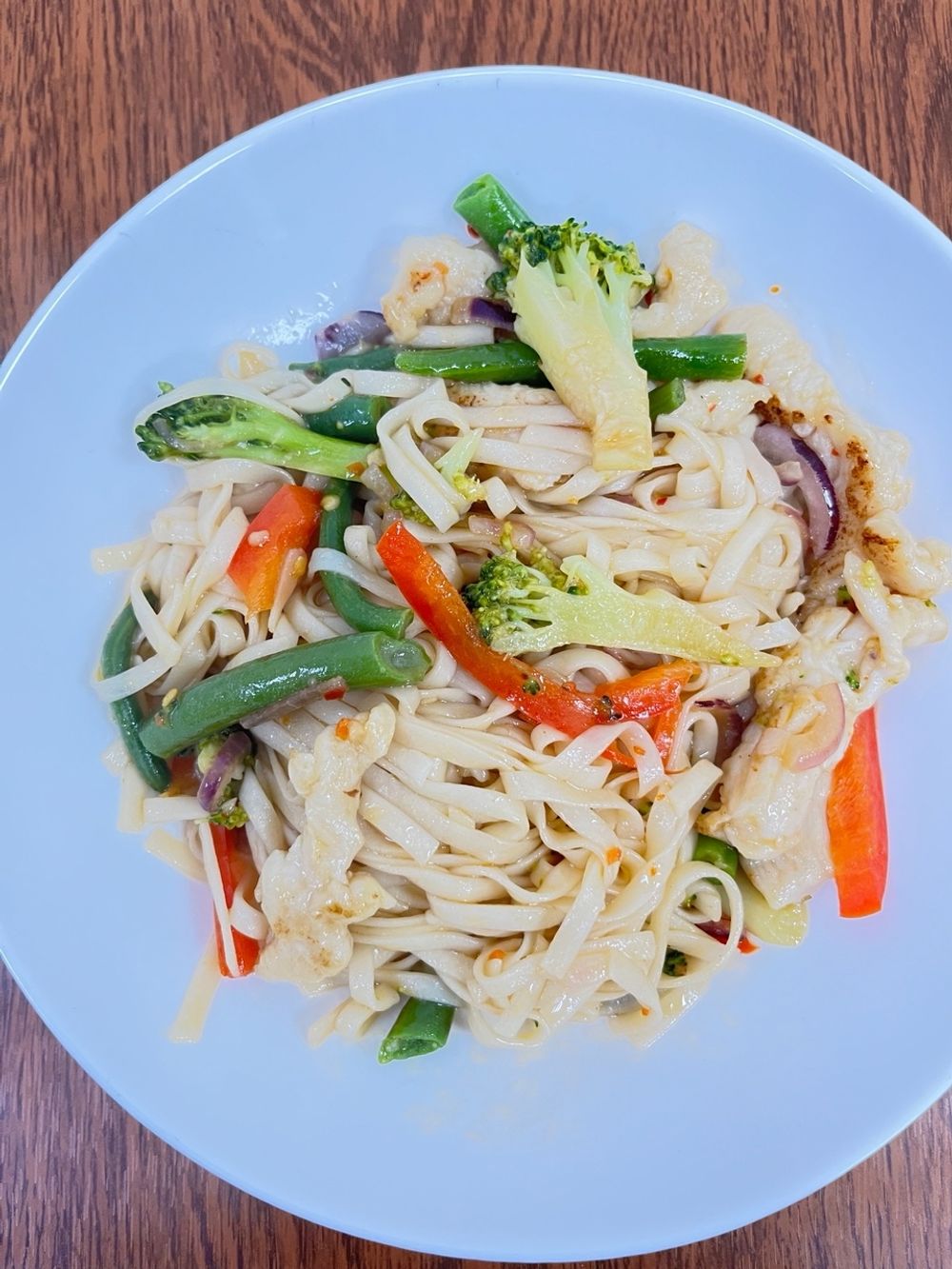 Состав:Лапша удон,Курица,Перец болг,Фасоль,Брокколи,Лук красный,Соус Сладкий чили.