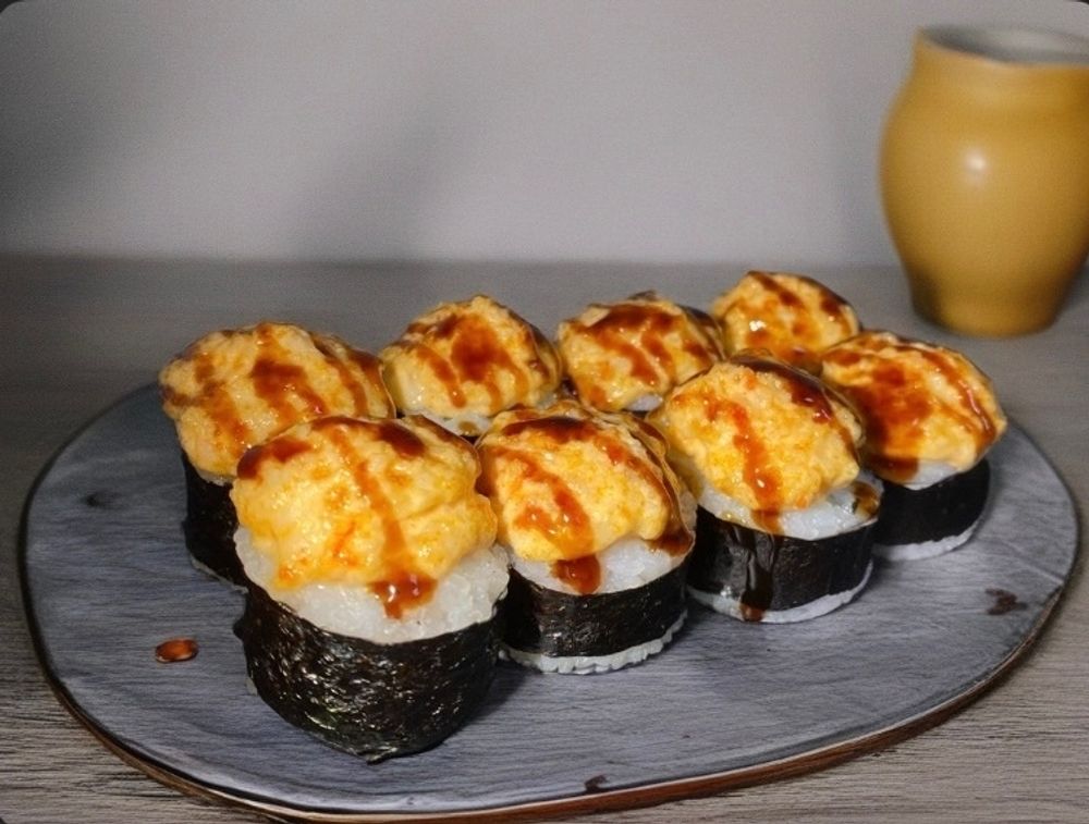 Состав:Рис,нори,сыр творожный,огурцы,креветки,ширачи,пармезан ,майонез