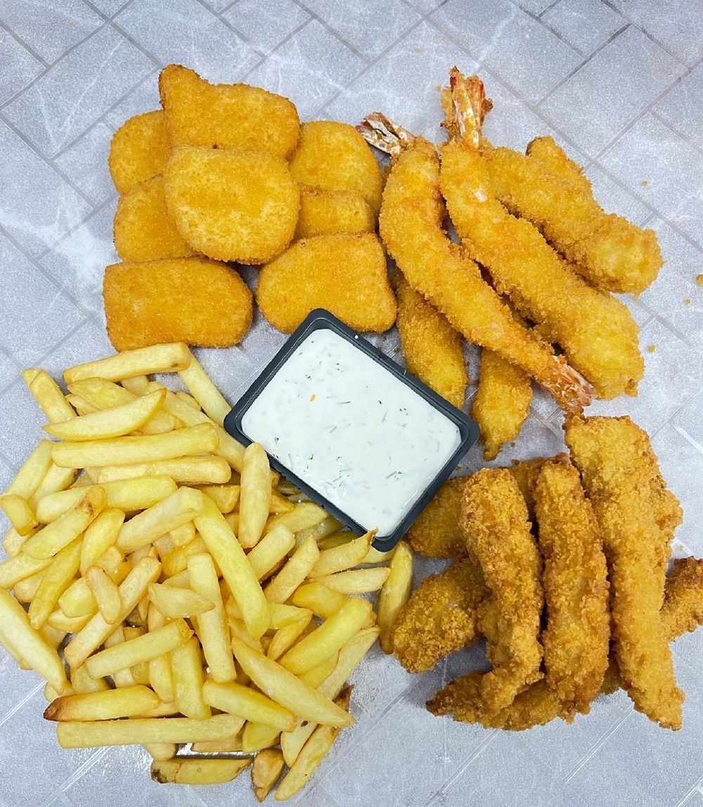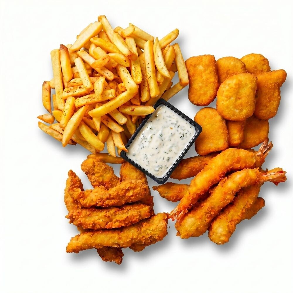 Состав:Картошка фри,Наггетсы,Эби темпура,Курочка в темпуре,Сметанный соус.