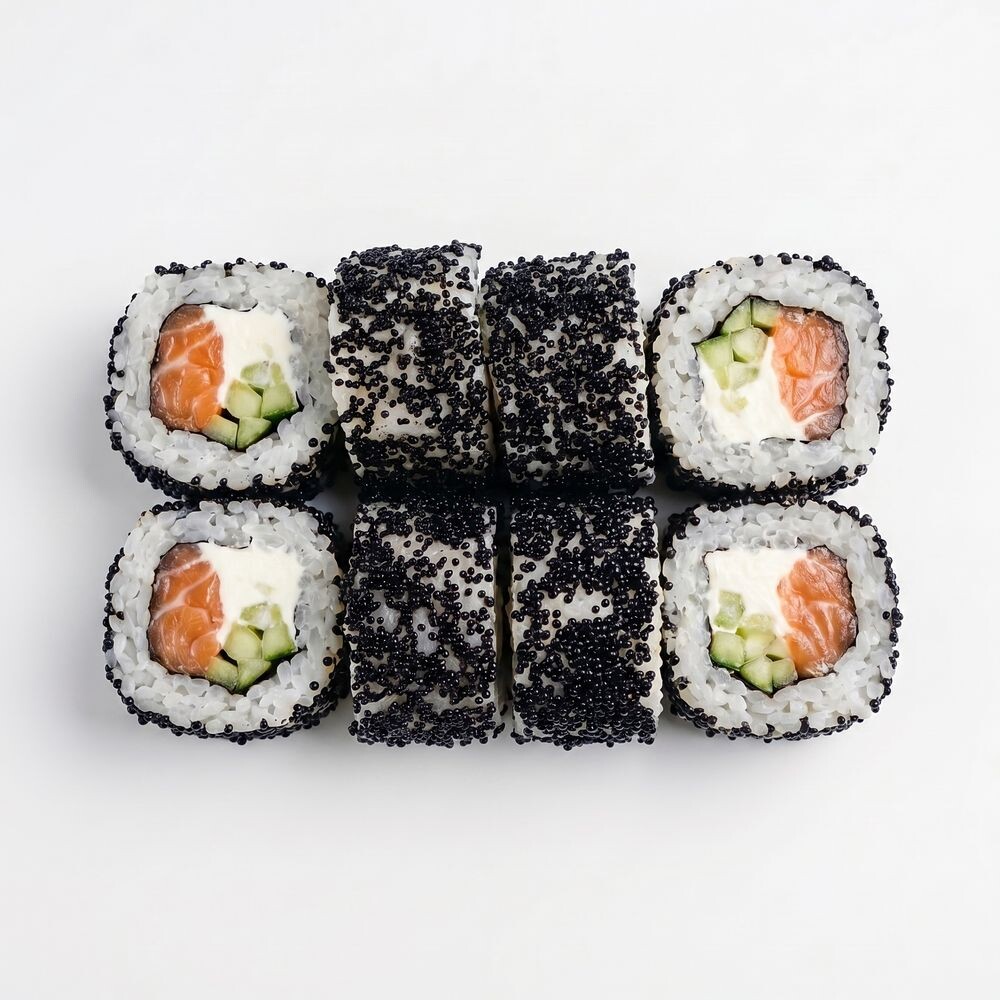 Состав:Рис,Нори,Сыр,Лосось,Огурец,Масаго