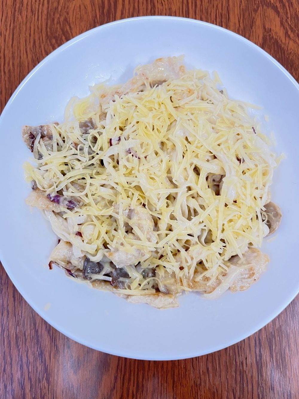 Состав:Лапша удон,Курица,Шампиньоны свежие,Лук красный,Сливки,Пармезан.