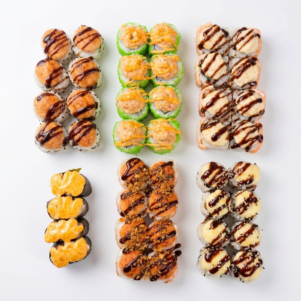 Состав:Фулл Фиш,Нежный бекон,Нежный угорь,Запеченный мидии с чесноком,Запеченная фила с кальмаром и креветкой,Запеченные гунканы(лосось,креветка,тунец,угорь).