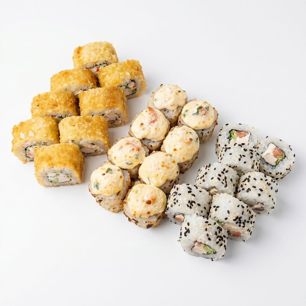 Состав:Цезарь темпура,Цезарь с креветкой,Цезарь с курицей.Количество: 24 шт.