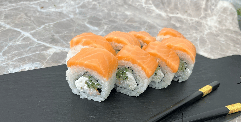 Состав:Рис,Нори,Сыр,Креветки,Лосось,Огурцы.