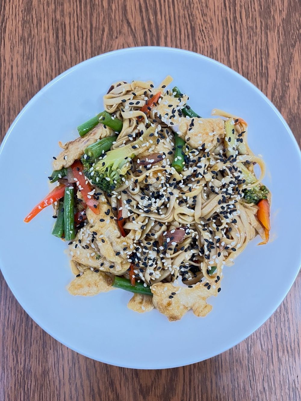 Состав:Лапша удон,Курица,Перец болг,Фасоль,Брокколи,Лук красный,Соус Терияки.
