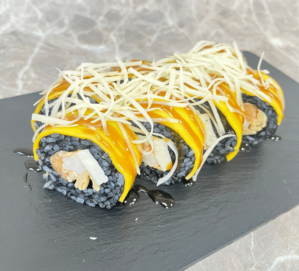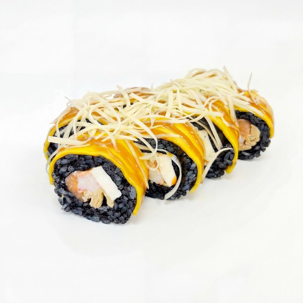 Состав:Рис,Нори,Креветки,Лосось,Снежный краб,Омлет,Пармезан,Терияки,Сыр чеддер,Спайс.