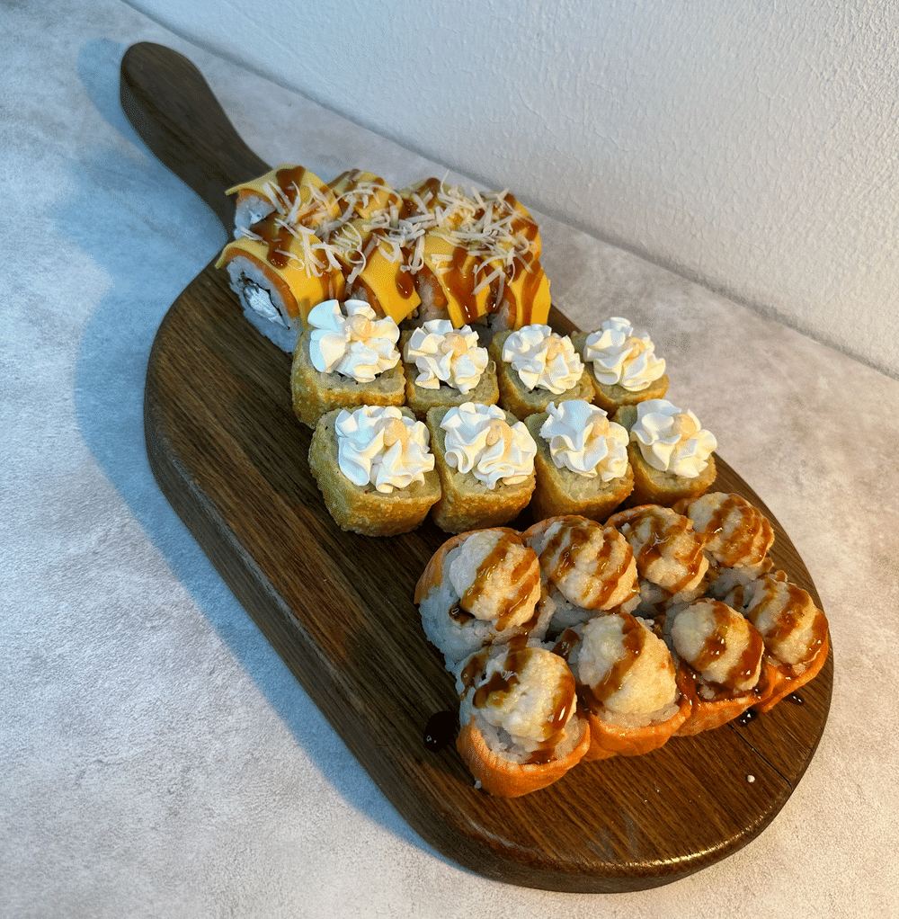 Состав:Фила чеддер,Запеченная фила с кальмаром и креветкой ,Сырная темпура.Количество:24 шт